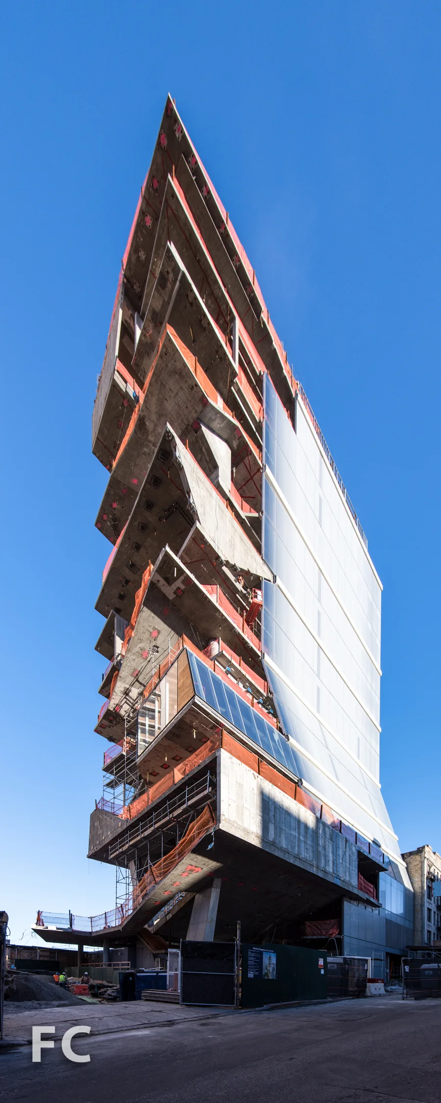 Curtain wall installation has begun on the "Study Cascade" section of Diller Scofidio + Renfro and Gensler's 14-story building for the Columbia University Medical College. The more normative northern half of the building has been almost completely clad with its exterior wall, a gradient of transparent and opaque white glass panels. Installation of the more expressive, transparent curtain wall on the "Study Cascade" has begun on the fourth floor at the southeast corner. The varying levels of transparency of the facade serves as an expression of the functional diagram of the building, where work spaces are located in the more opaque northern portion of the building while spaces for casual interaction occur in the transparent, free form "Study Cascade."