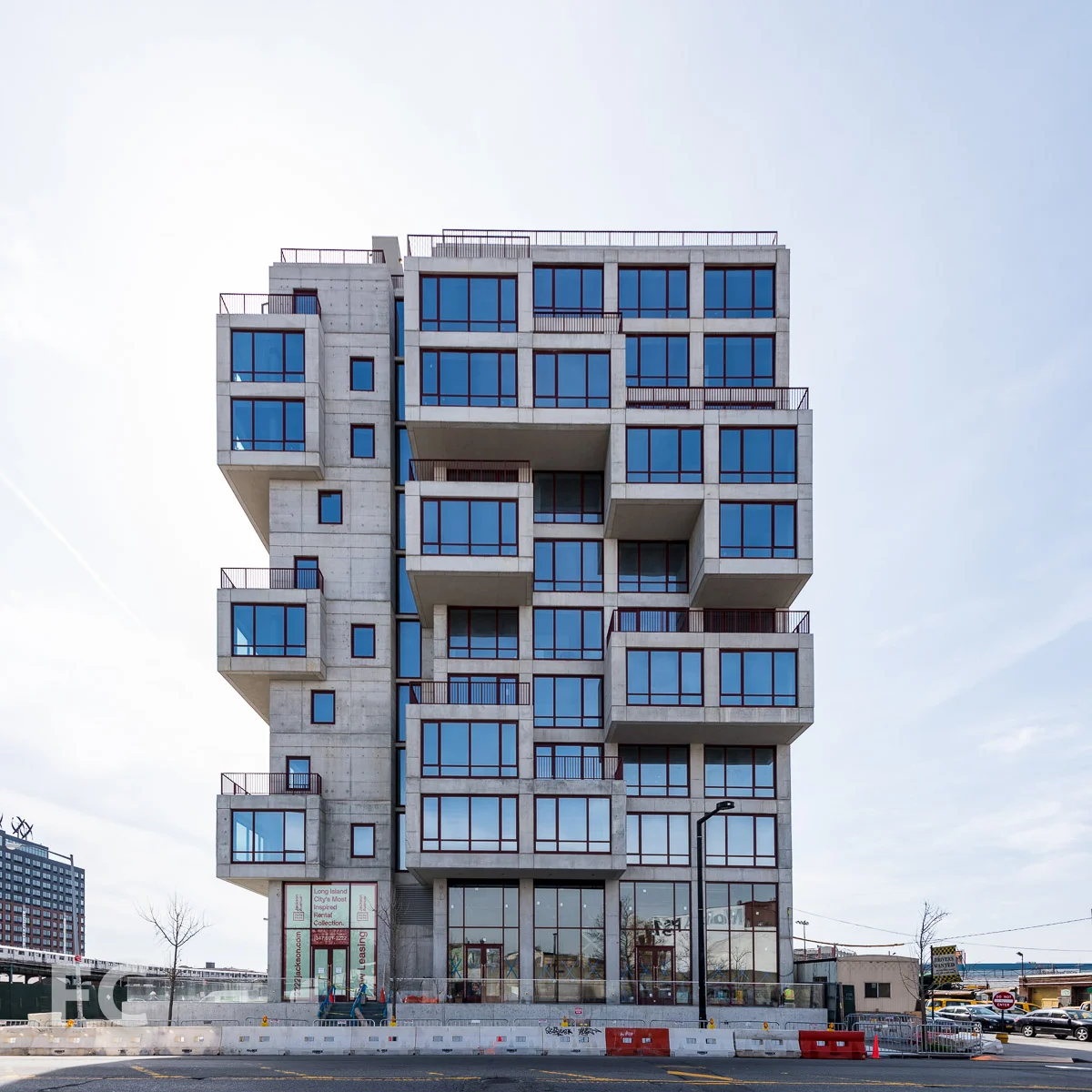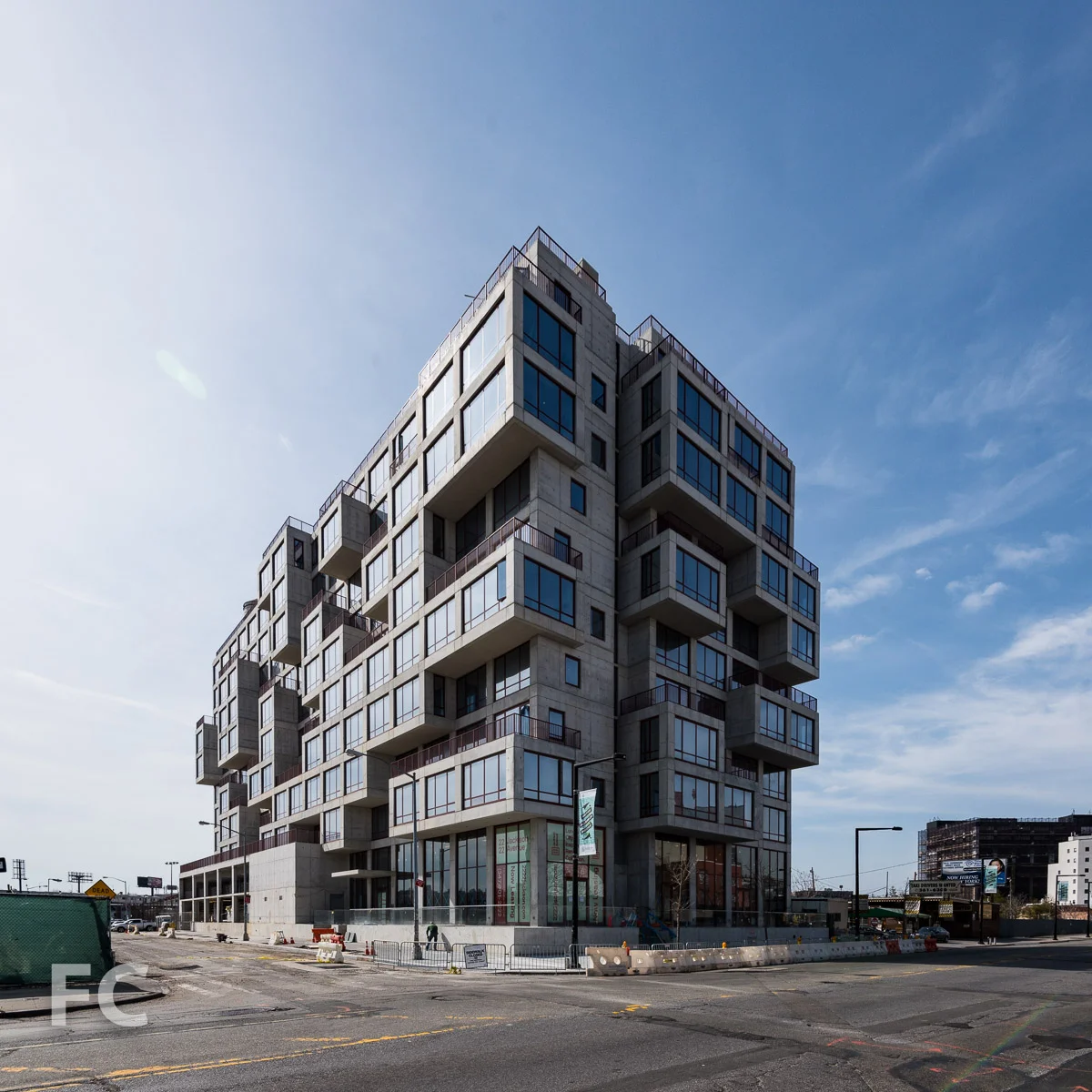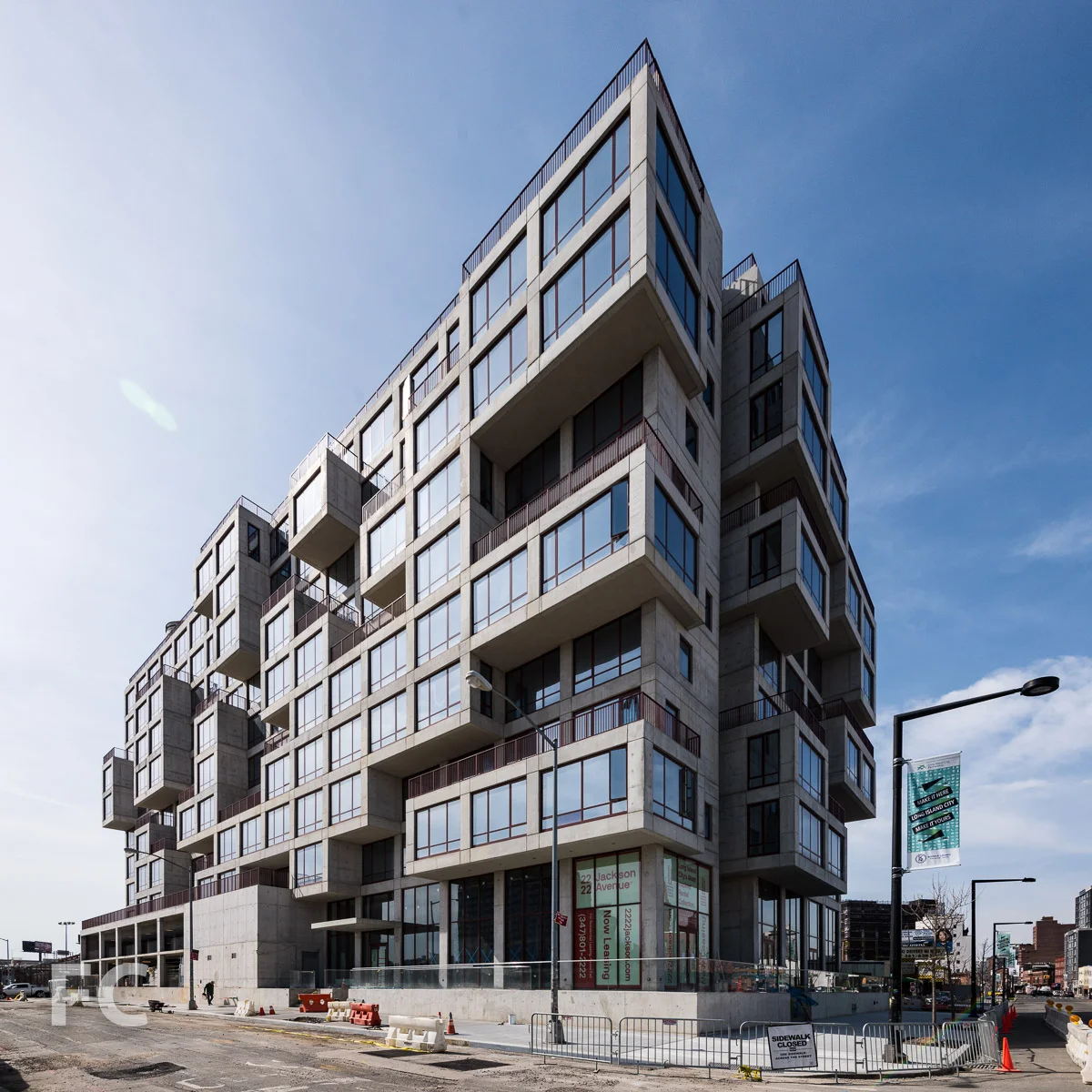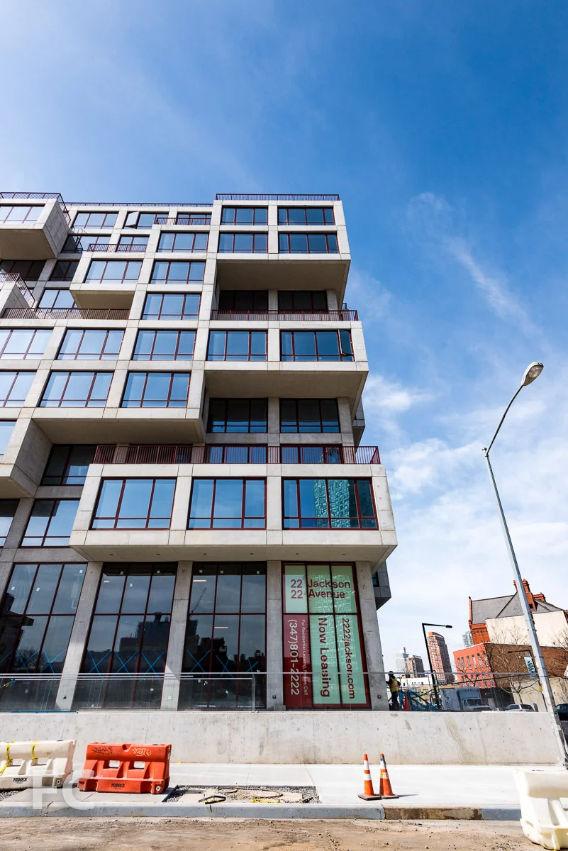 Construction is wrapping up at the Gershon Company's 22-22 Jackson Avenue in Long Island City. Designed by the prolific firm ODA, the massing of the 11-story, 175-residential-unit mixed-use building features the firm's signature stacked forms in a playful jumble of ins and outs. Maroon framed windows are installed in the distinct boxes created by the exposed concrete structure. The massing also provides opportunities for residential terraces atop the protruding boxes but the maroon railings detract a bit from the purity of the massing diagram. Amenities for the project are housed in the two story base and include a lobby, lounge, library spaces, gym, indoor pool, and a landscaped courtyard on the 3rd floor roof deck. The project looks to be near ready for its first tenants.