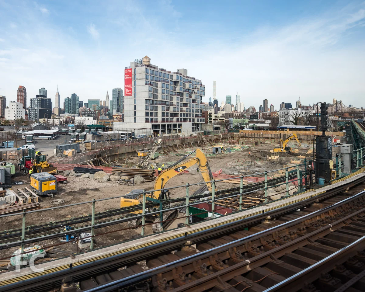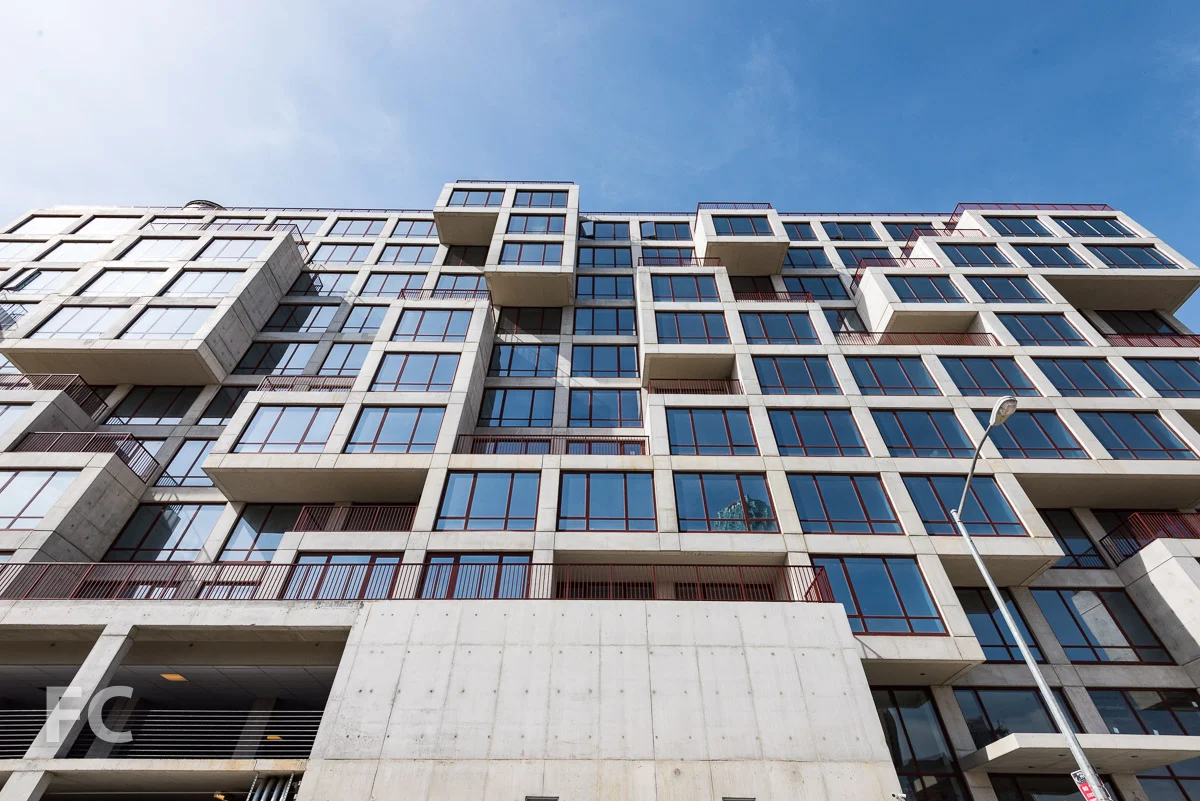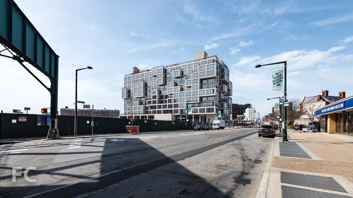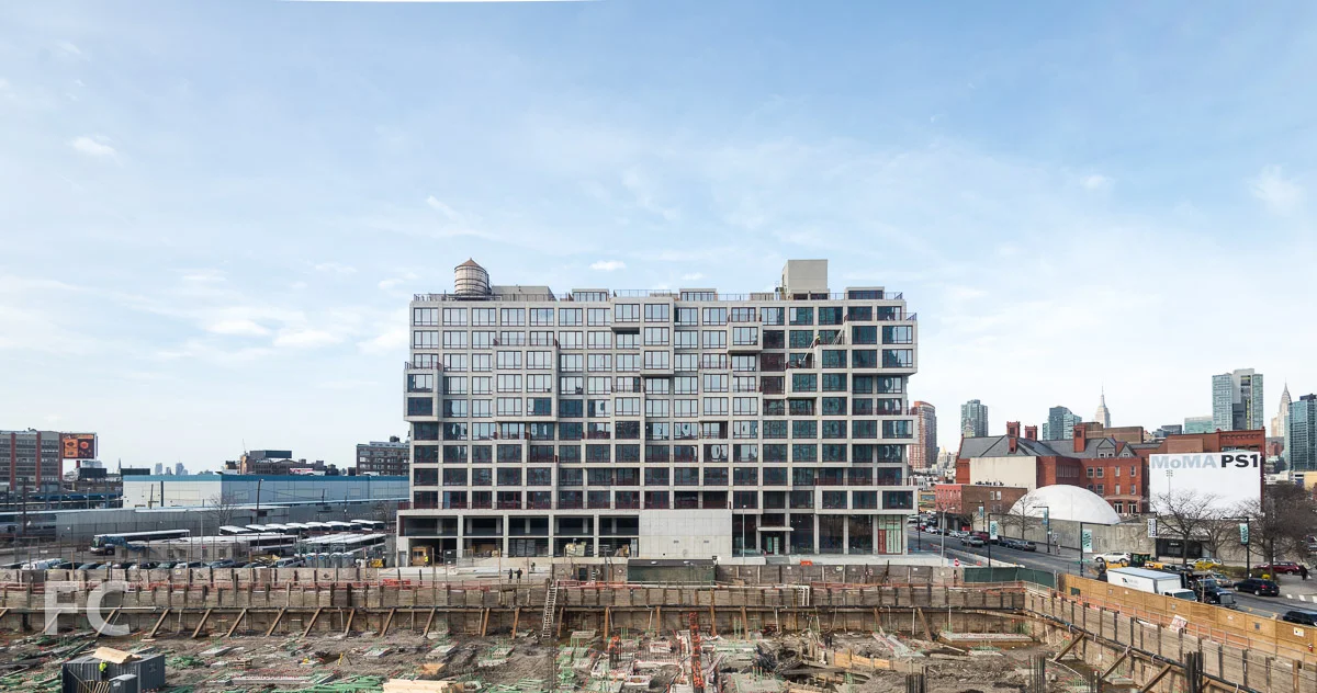 Construction is wrapping up at the Gershon Company's 22-22 Jackson Avenue in Long Island City. Designed by the prolific firm ODA, the massing of the 11-story, 175-residential-unit mixed-use building features the firm's signature stacked forms in a playful jumble of ins and outs. Maroon framed windows are installed in the distinct boxes created by the exposed concrete structure. The massing also provides opportunities for residential terraces atop the protruding boxes but the maroon railings detract a bit from the purity of the massing diagram. Amenities for the project are housed in the two story base and include a lobby, lounge, library spaces, gym, indoor pool, and a landscaped courtyard on the 3rd floor roof deck. The project looks to be near ready for its first tenants.