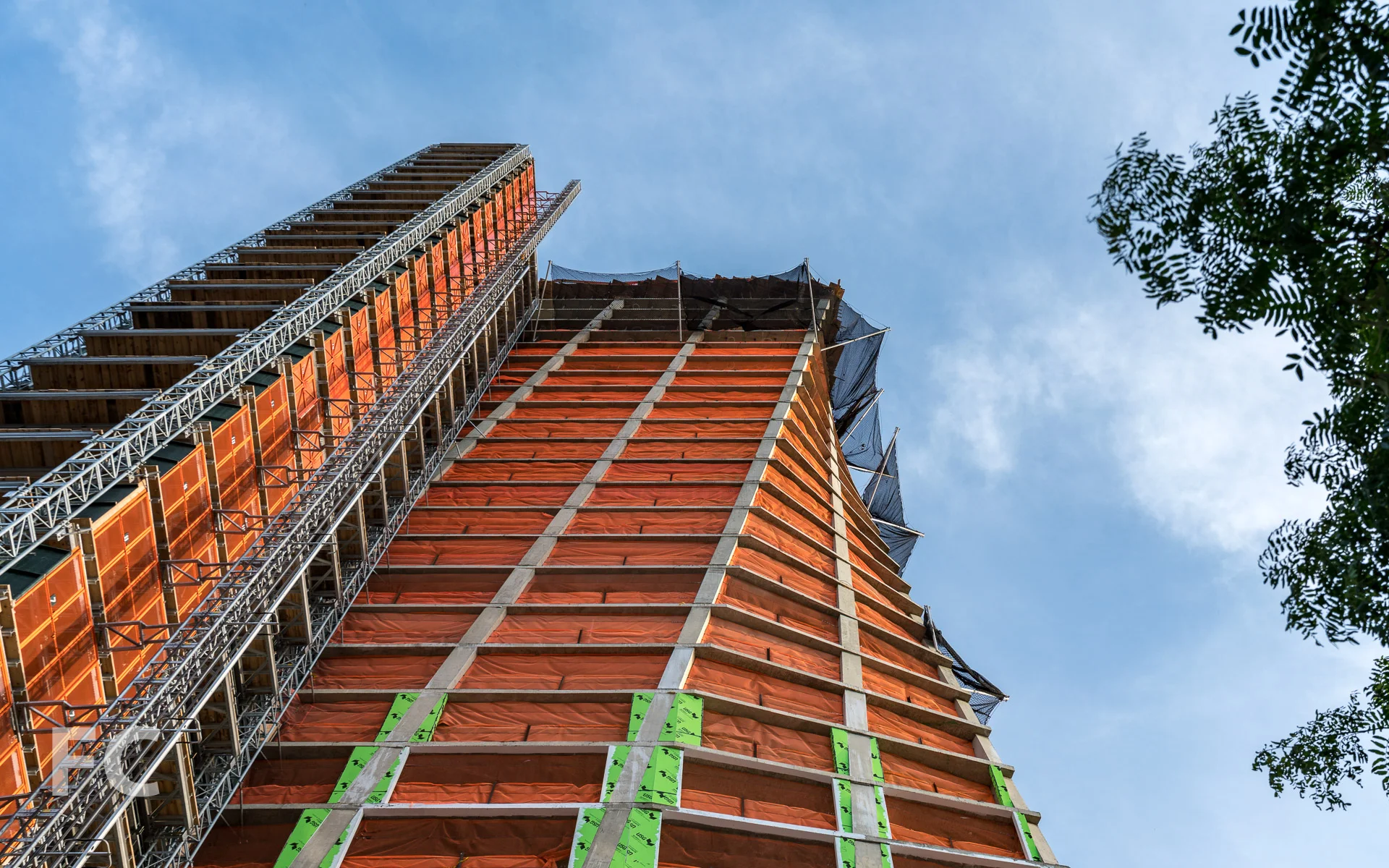Construction proceeds at HFZ Capital Group's The Eleventh, a mixed use development at 76 11th Avenue. Designed by the Bjarke Ingels Group (BIG), the development consists of two twisting towers atop an 85 foot podium adjacent to the High Line. The 34-story west tower will rise 400 feet and consist of residential units and supporting amenities. A 25-story east tower will rise 300 feet and consist of a mixture of residential units on the upper floors and a Six Senses hotel on the lower floors. Currently, the west tower's superstructure is close to topping out and installation has begun on the the first of its window units, while the east tower will soon start to rise.