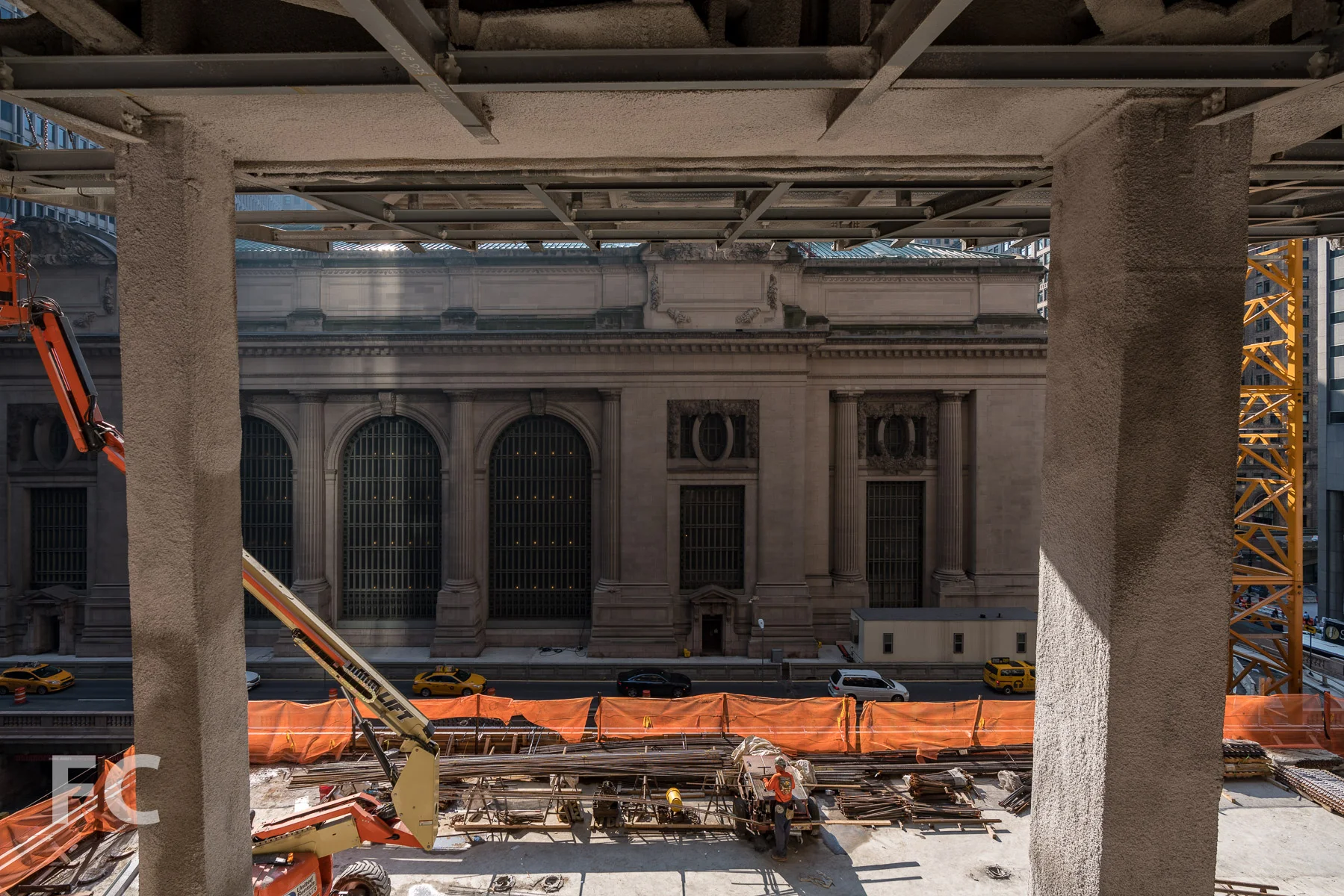 Construction continues at One Vanderbilt, SL Green's 58-story future supertall tower on a site adjacent to New York's Grand Central Terminal. Designed by KPF, the mixed-use tower will rise 1,401 feet into the Midtown skyline. The steel superstructure has reached the one third mark, surpassing the framing for the sloped glass atrium and well into the typical office floor plates.