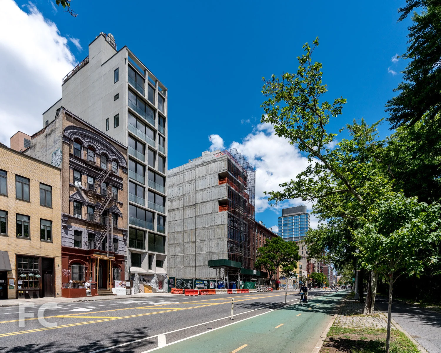At the south end, the 10-story residential condo building at 165 Chrystie Street is nearing completion. The project features a concrete superstructure that is expressed on its east facade along with bays of floor-to-ceiling window wall and glass railing.