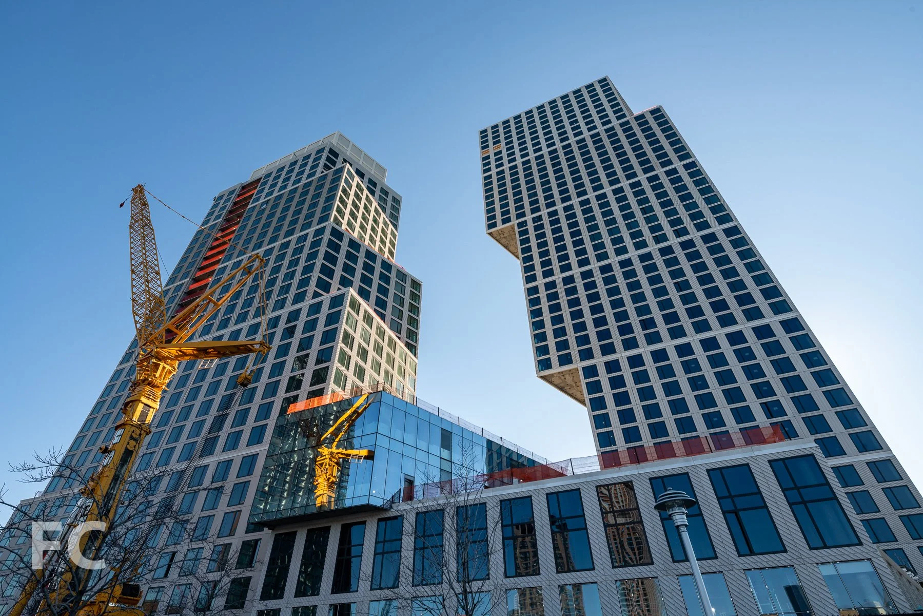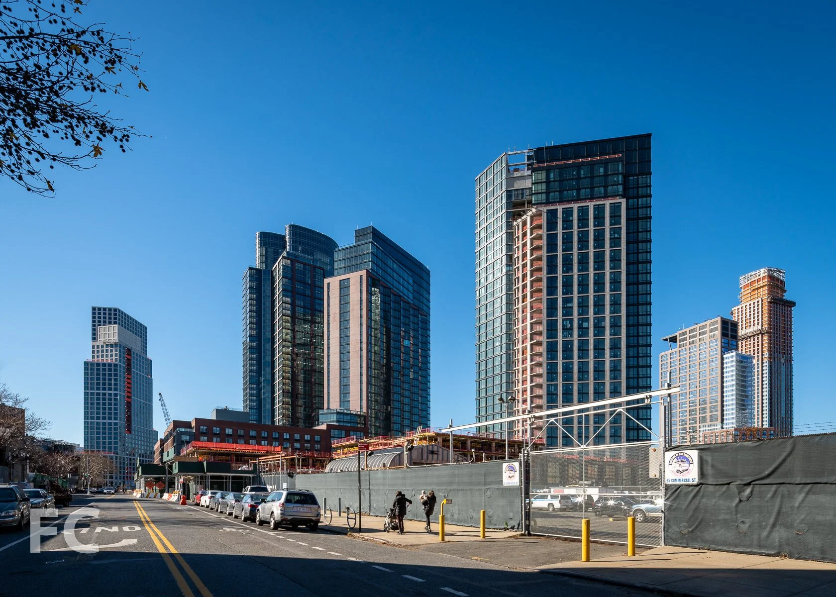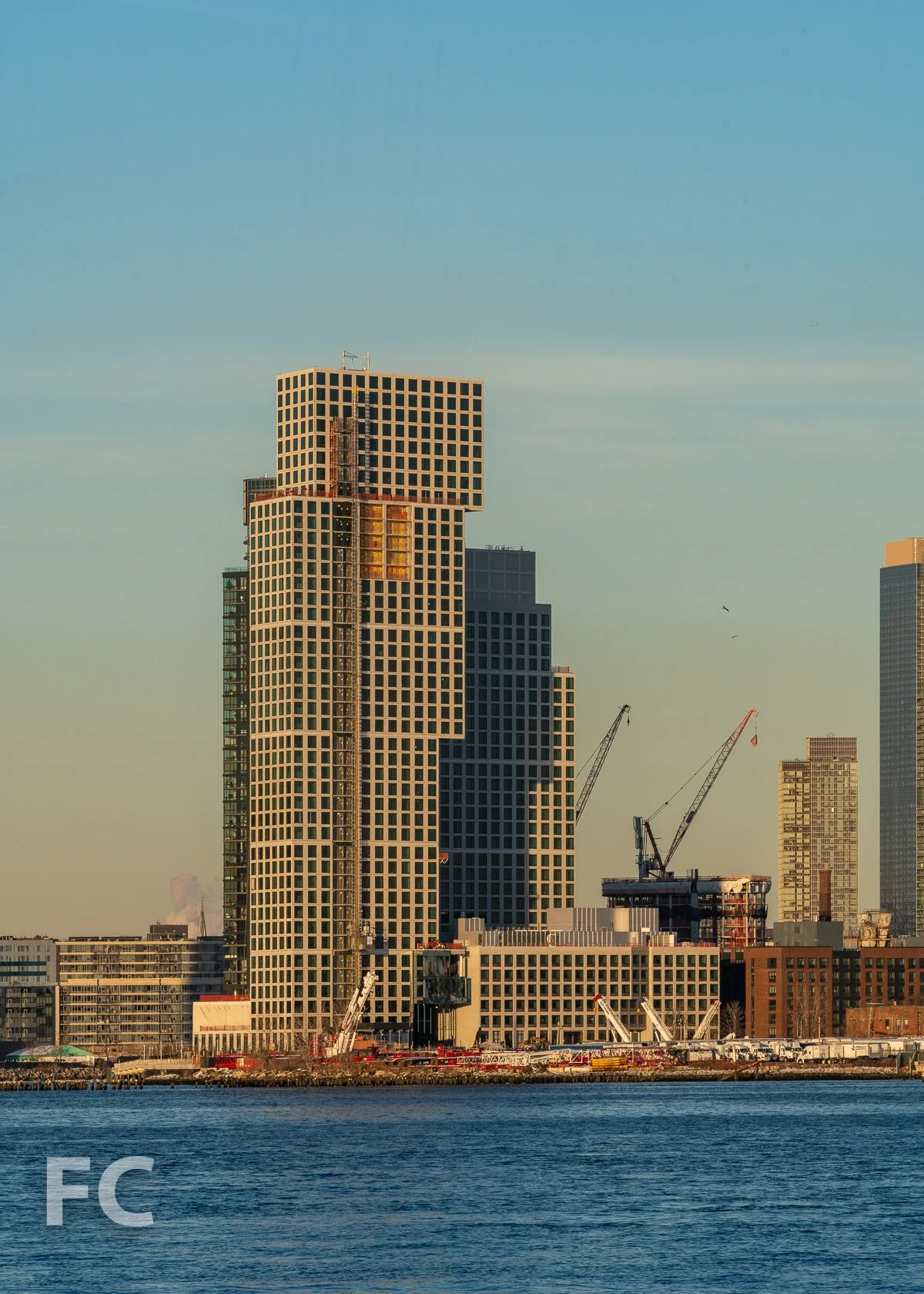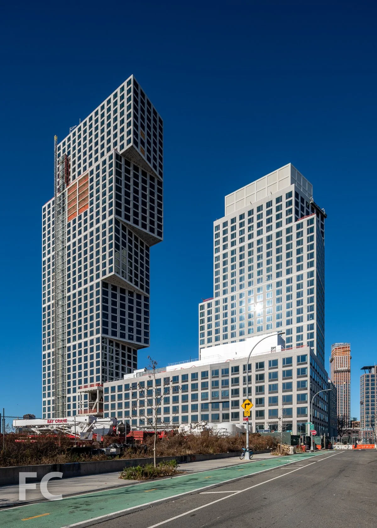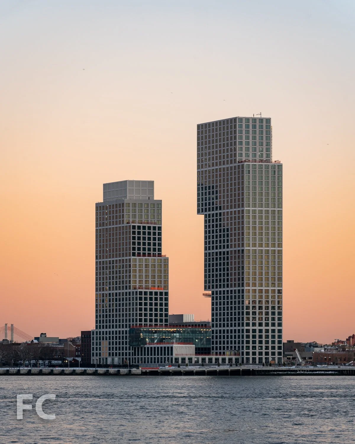 The two towers are linked by a bridge that contains a pool and fitness center with Manhattan skyline views.