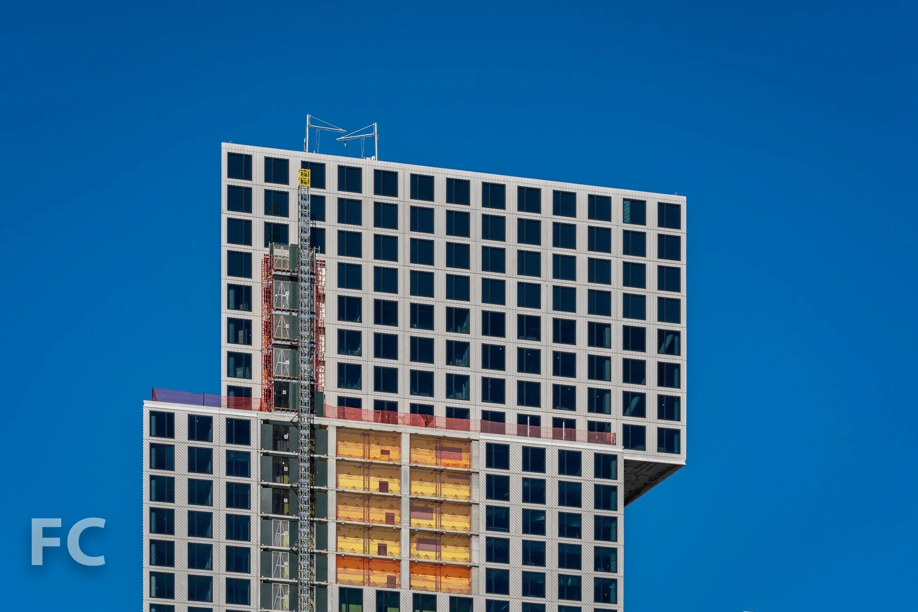 The form of the taller southwest tower features four inverted cantilever phases on the 14th, 21st, 28th, and 36th floor that extend the cantilever to a total of 50 feet from the base structure to the top floors. At each cantilevered phase, engineered steel truss platforms were installed to support and take the load of the cantilever during construction. Once the platforms are removed, the cantilevered slabs are supported by sloping columns designed to transfer the load back to the structure and hung columns reinforced with multi strand post tension to support the structure suspended from above, like a suspension bridge. The post tension multi strand reinforcing, protected by plastic sleeves, is pulled at the top of each column to bring them into tension to support the cantilever.