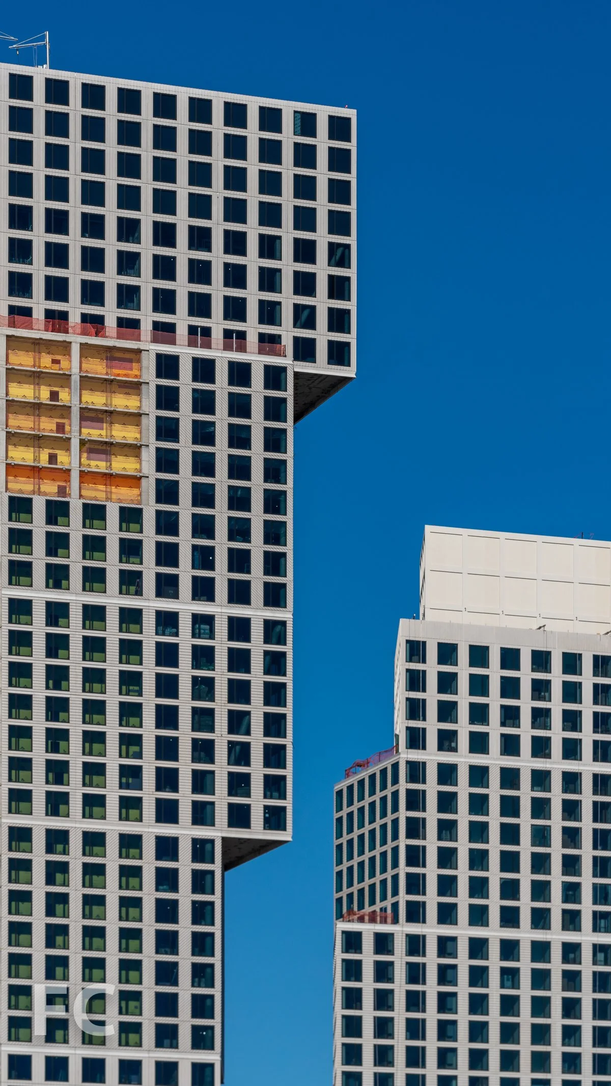 Precast concrete panels with 8 foot square windows clad the towers and feature angled planes that change orientation with each block of setbacks and cantilevers.