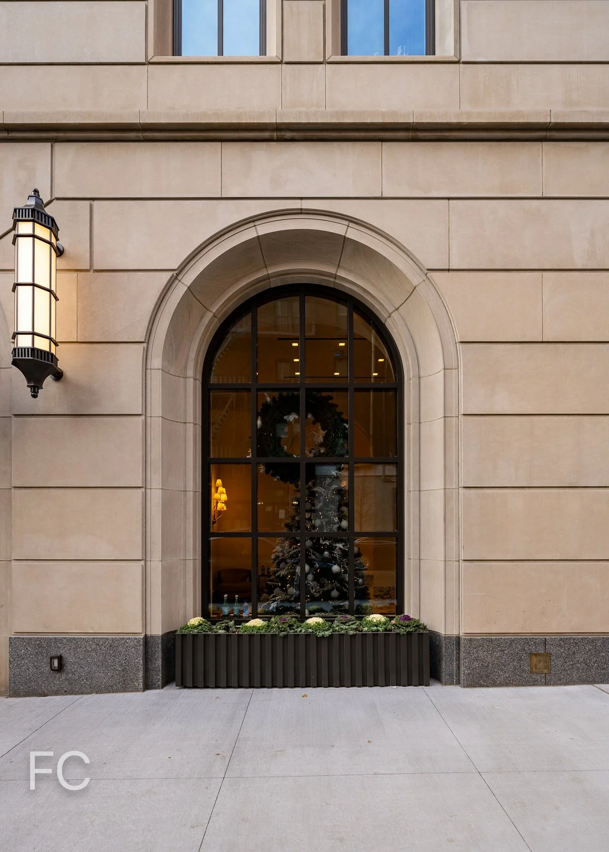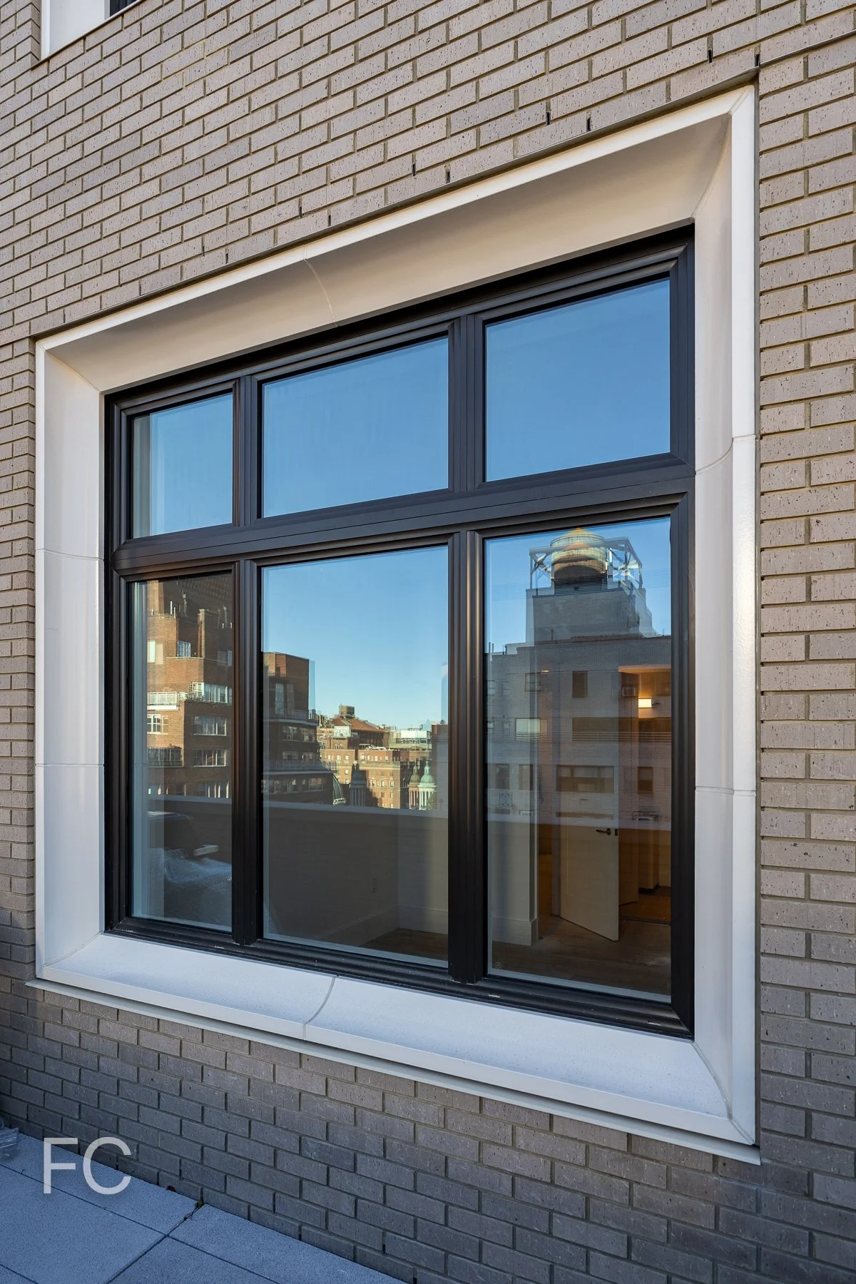 Facade detail of a window with glazed terra cotta frame.