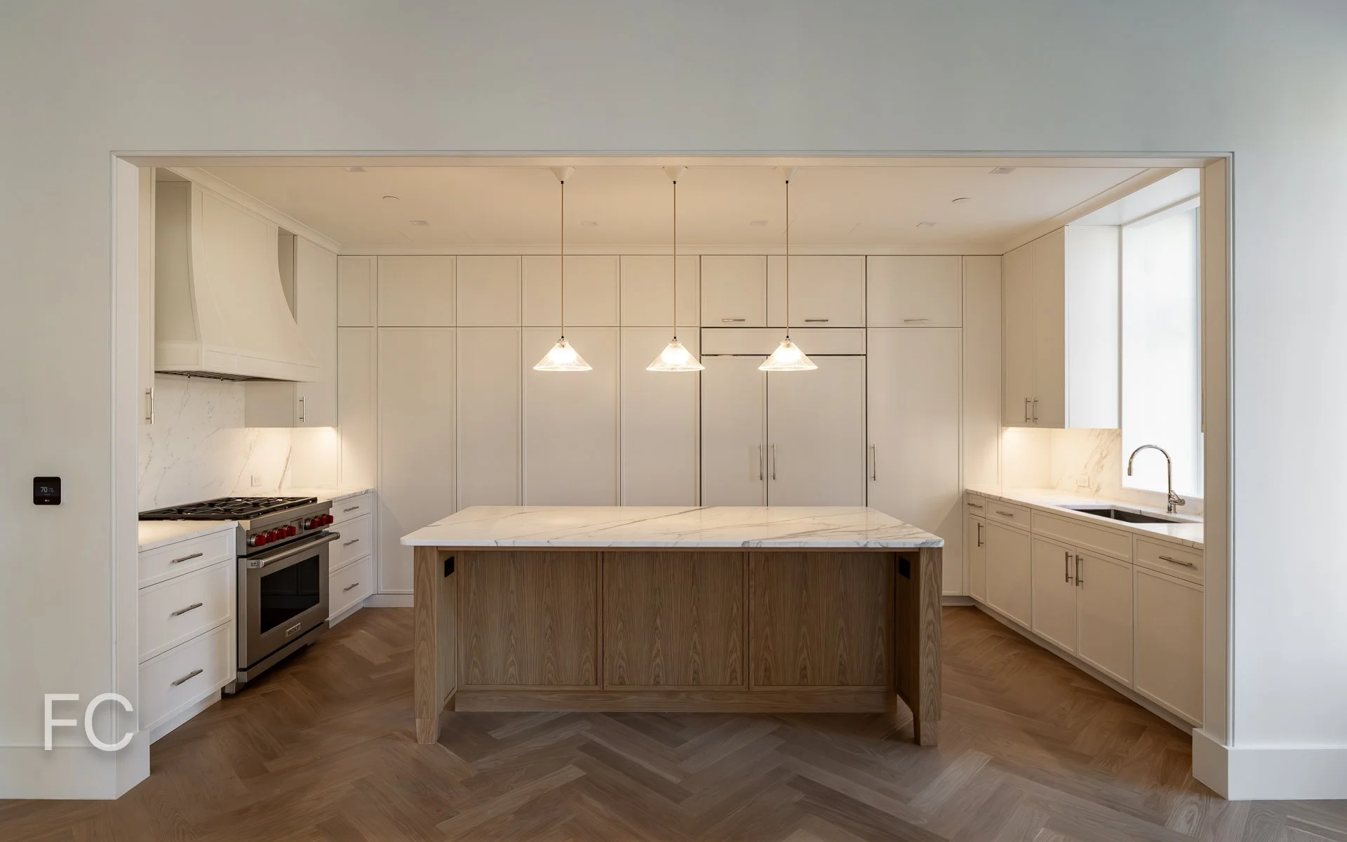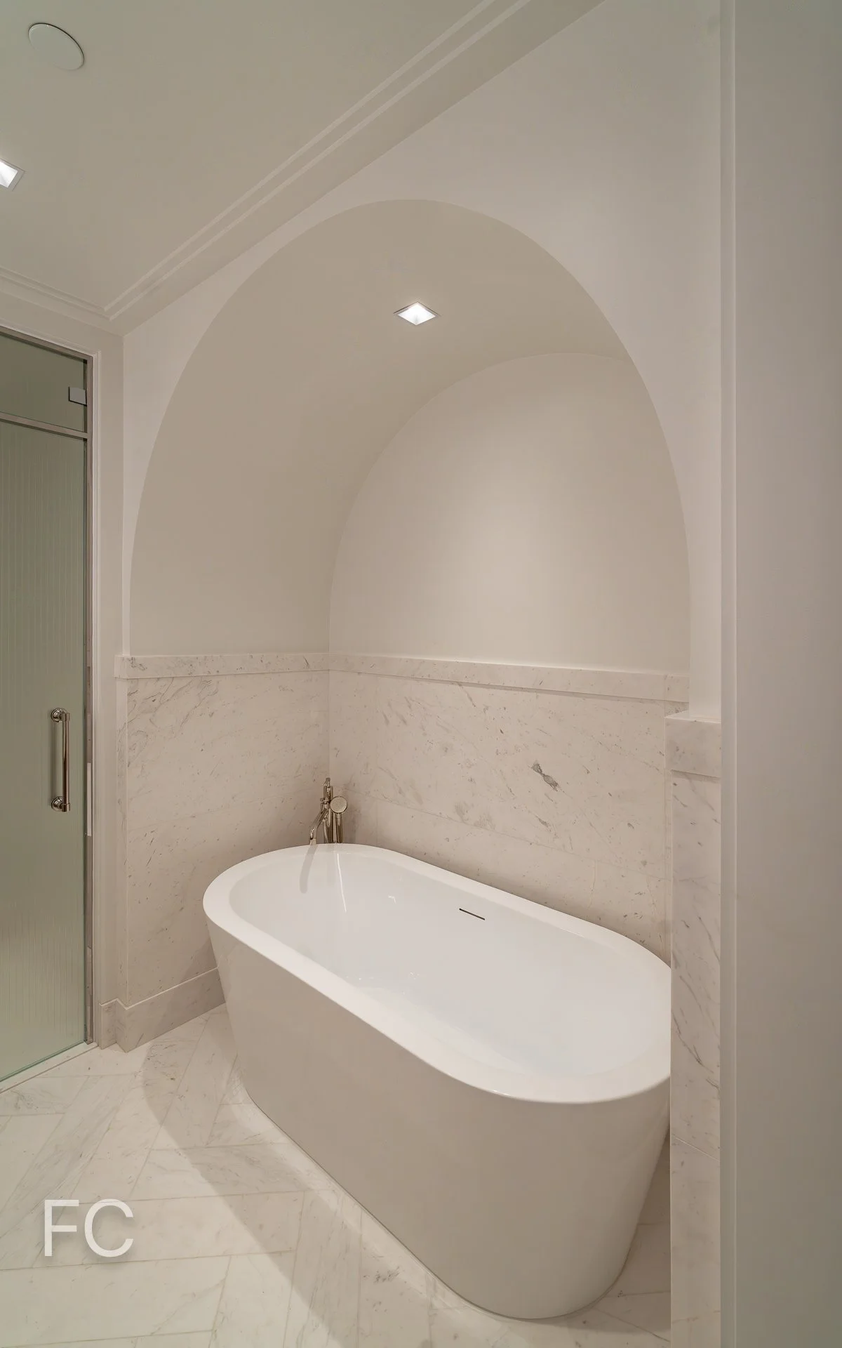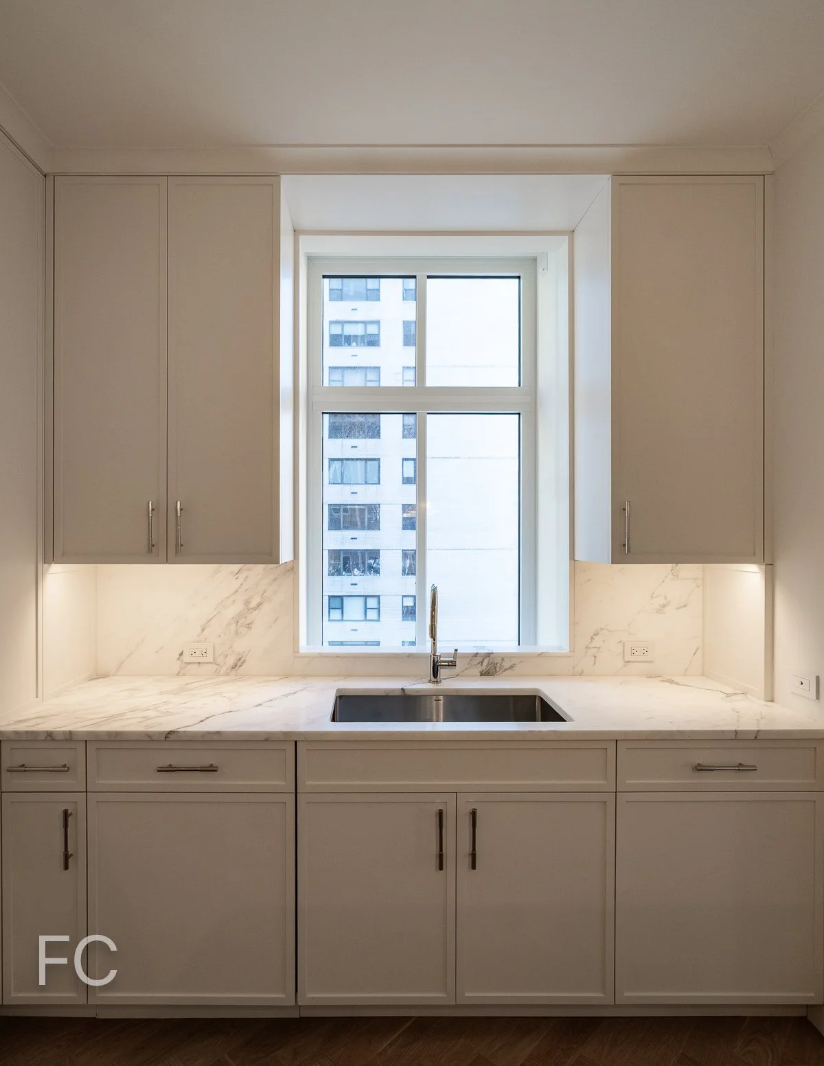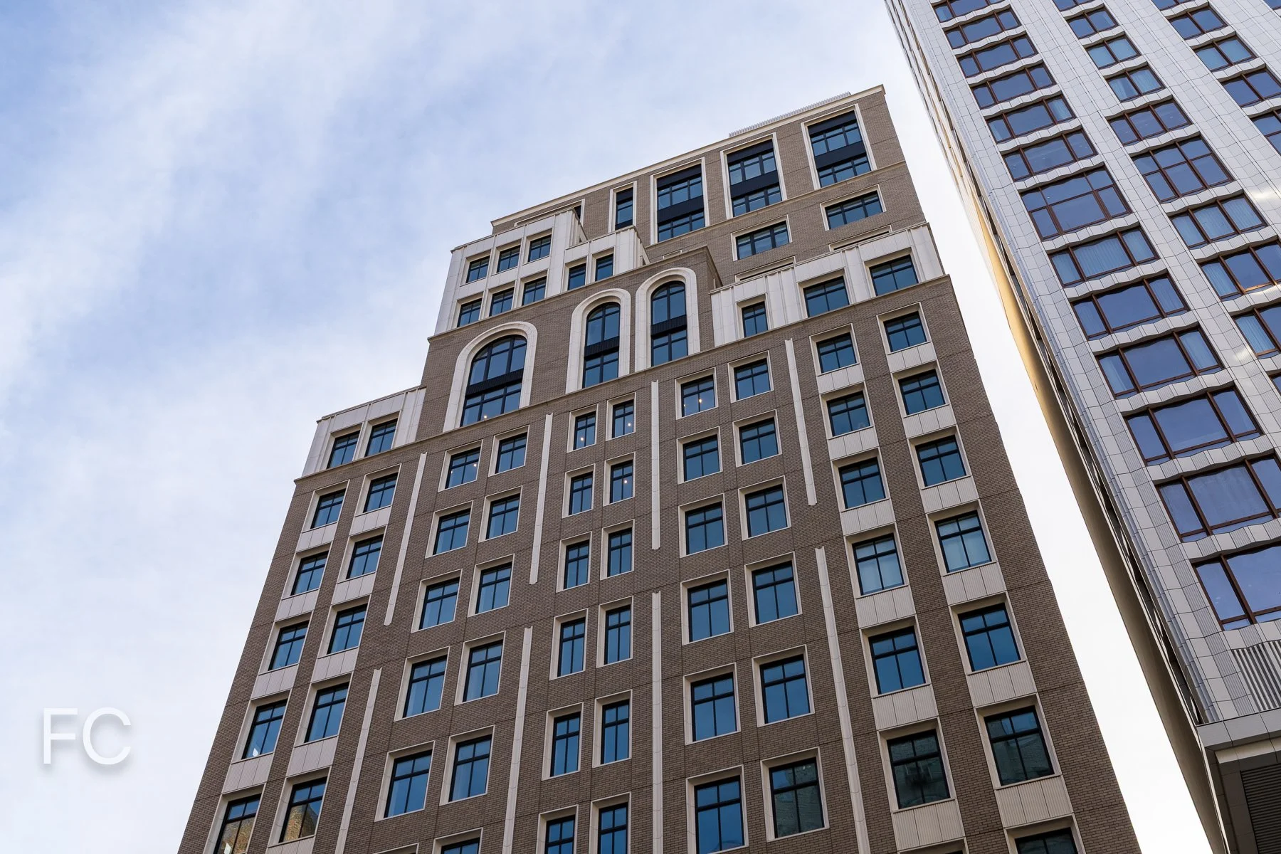 The tower offers 35 condominium residences designed by Yellow House Architects, including five full-floor penthouses. Residences feature herringbone oak wood flooring throughout. Kitchens include Italian Statuario Extra honed-stone, along with Wolf and Sub Zero appliances. Highlights of the primary bathrooms include a freestanding soaking tub, steam shower, and custom millwork vanity with silver nickel hardware.
