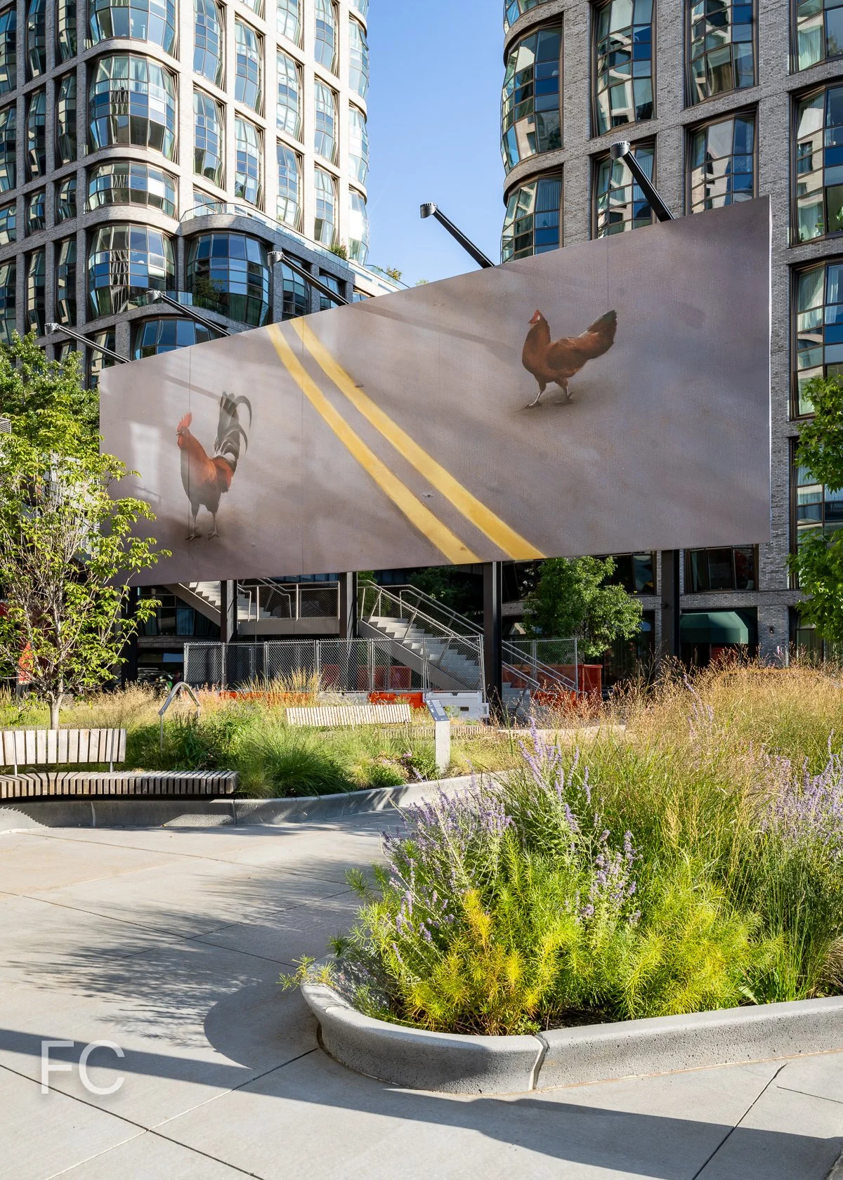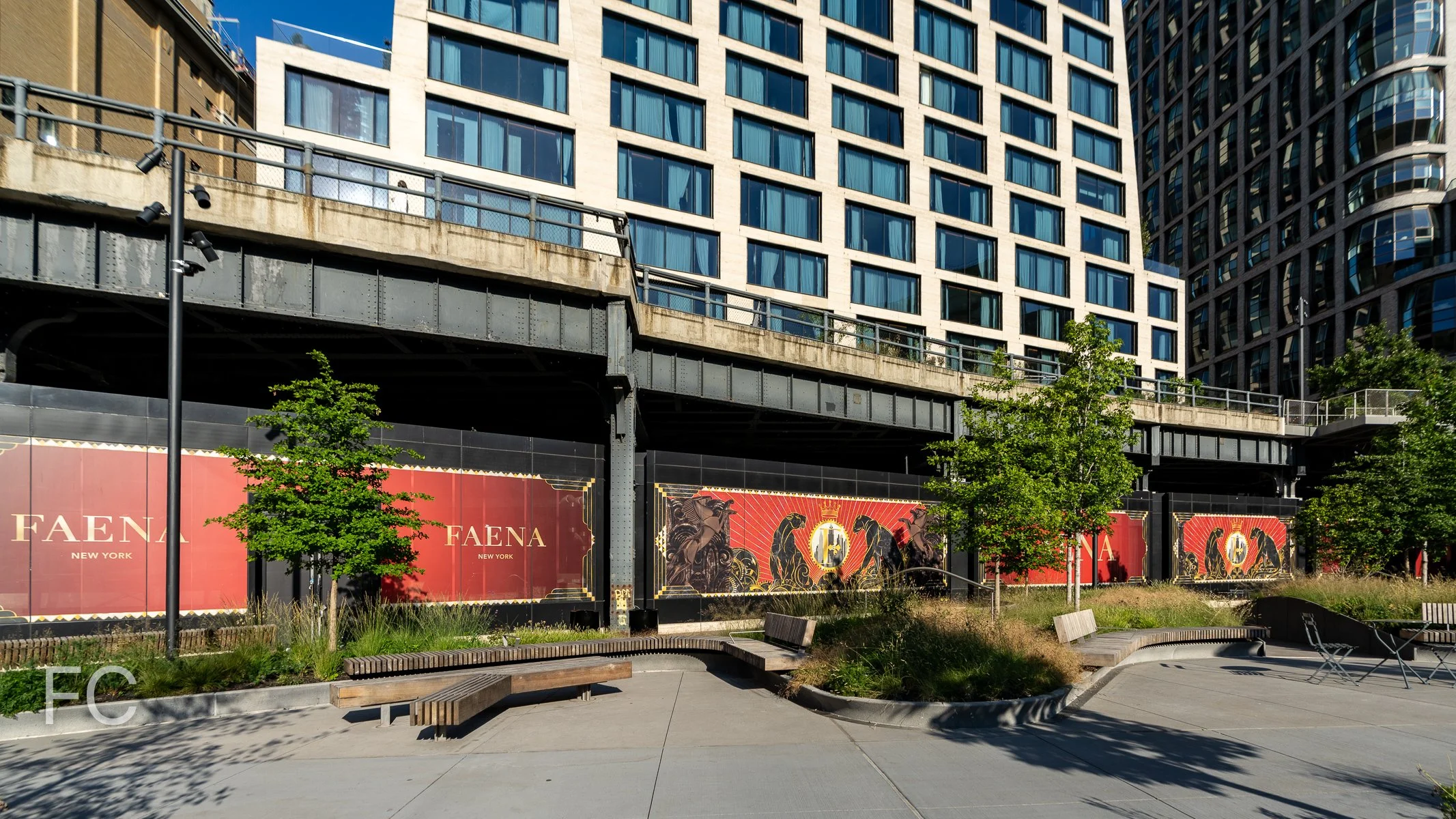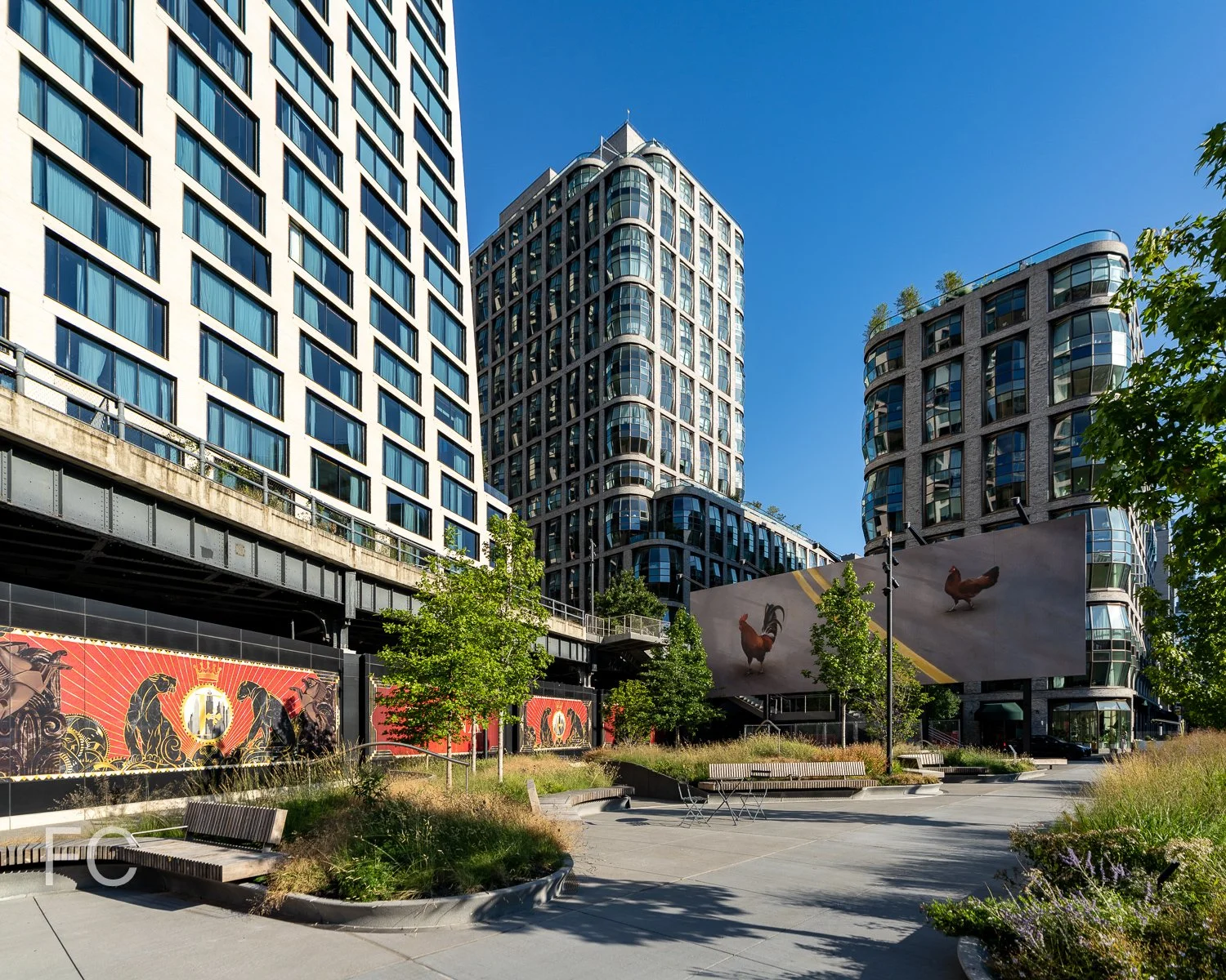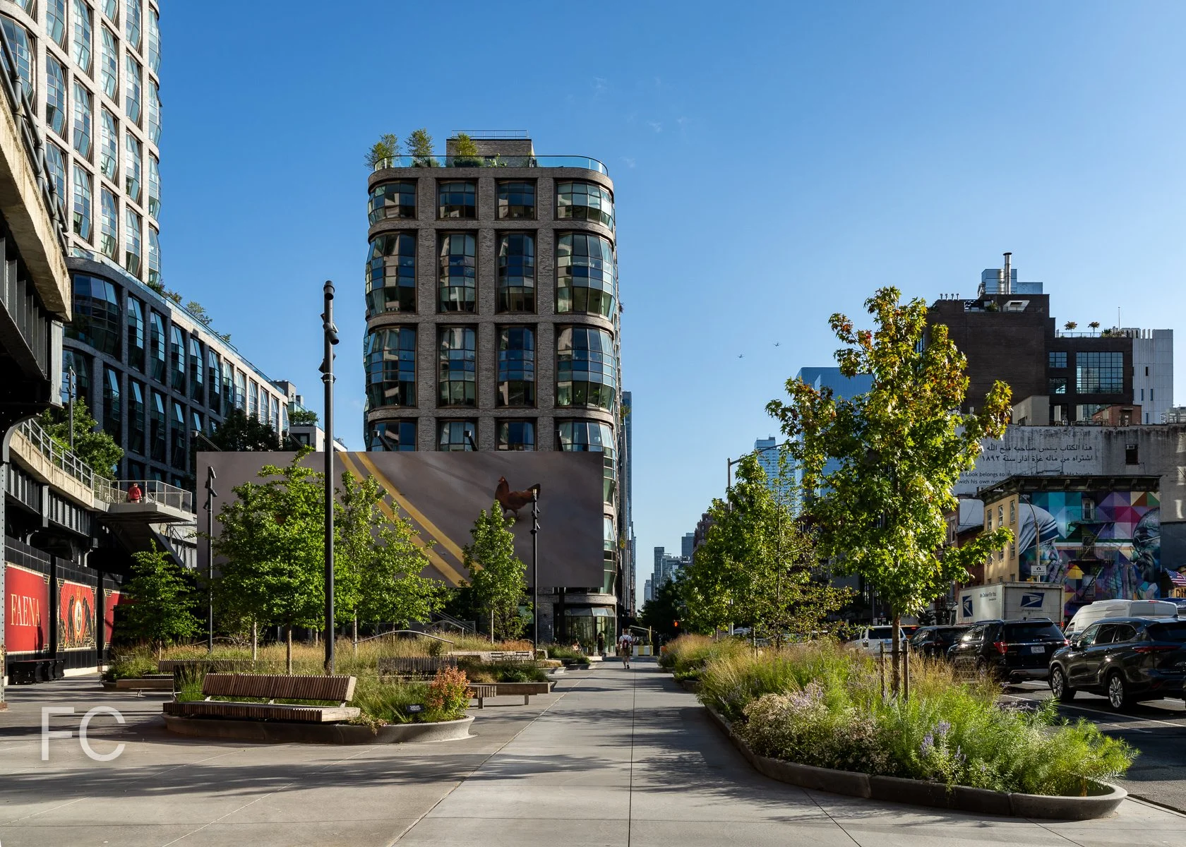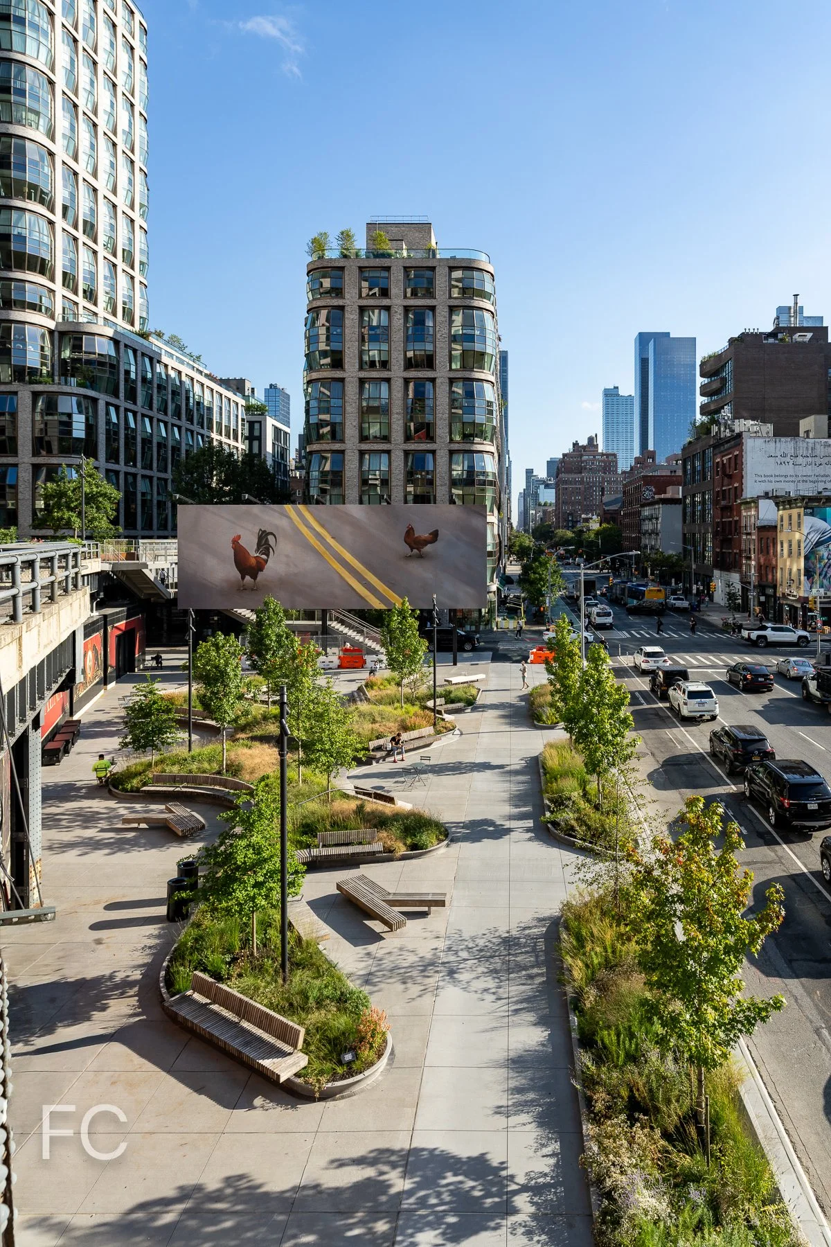 Construction has wrapped up at the new park adjacent to the High Line and the One High Line development. Designed by Field Operations and Diller Scofidio + Renfro, the public plaza features curvilinear concrete planters with wood slatted benches attached and freestanding. At the park’s northern boundary along 18th Street, there is a new staircase up to the High Line and a billboard that currently displays the artwork “Don’t ASK” by Allison Katz.