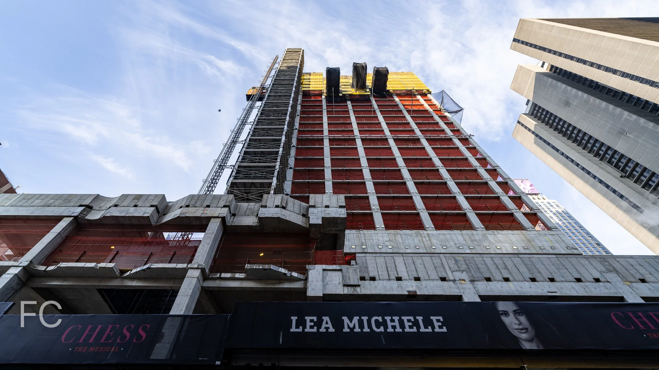 Looking up at the south facade from West 45th Street.