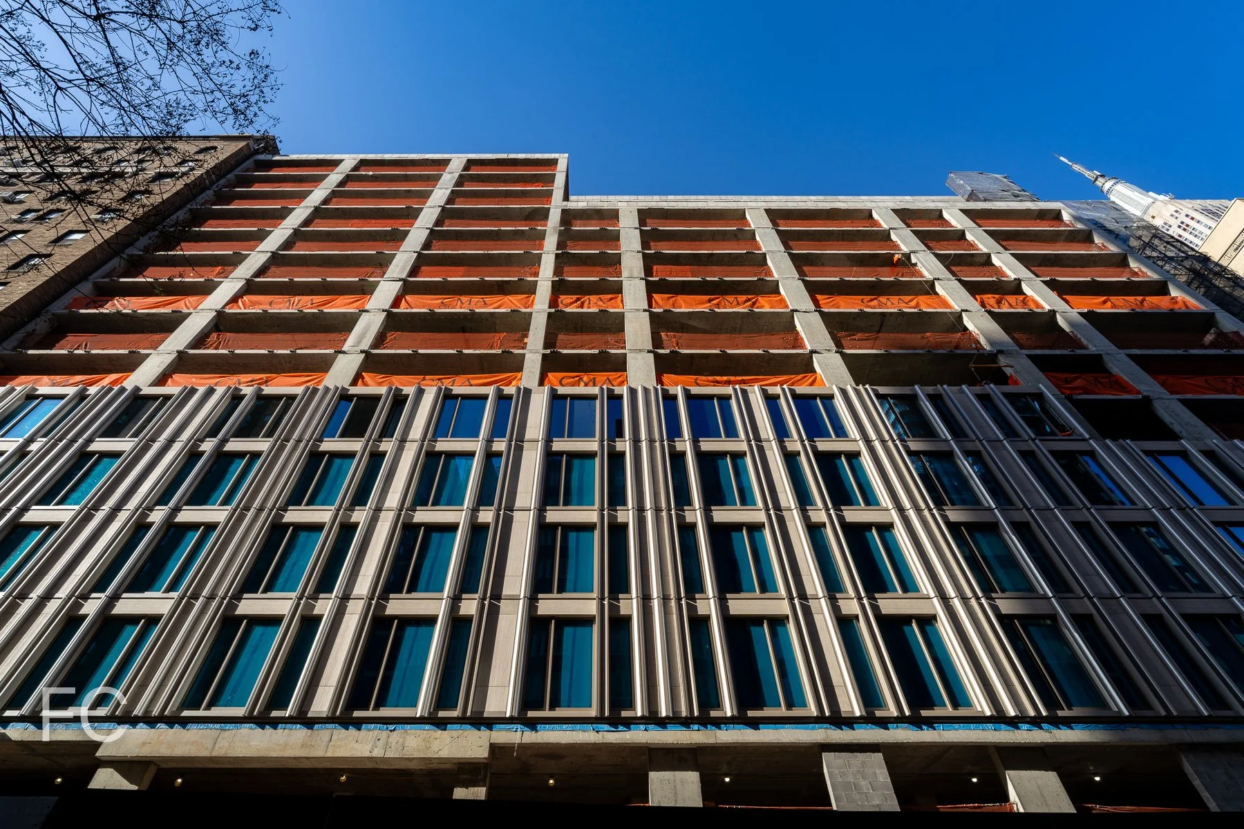 Facade installation is ongoing at the Continuum Company’s 18-story residential condo tower at 38 East 35th Street in the Murray Hill neighborhood of Manhattan. Several historic buildings previously occupied the site, including the former home of the Metropolitan Synagogue and the Community Church of New York, who sold the site to the developer in 2024.